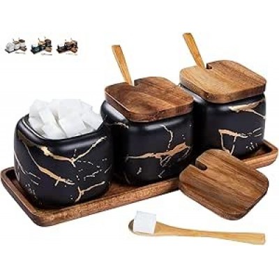 Telanks Juego de azúcar de cerámica, condimento de caja de 3 pcs con tapa, cuchara y bandeja, especi