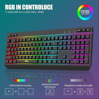 【Batteria Ricaricabile e di Lunga Durata】La combinazione è dotata di una batteria a lunga durata che consente un utilizzo continuo per 8 ore con la luce. La tastiera e il mouse sono dotati di funzioni intelligenti di risparmio energetico. Se non si effettuano operazioni entro 8 minuti, si mettono automaticamente a riposo; per risvegliarli è sufficiente premere un tasto qualsiasi. Si prega di caricare per 8 ore prima dell'uso.